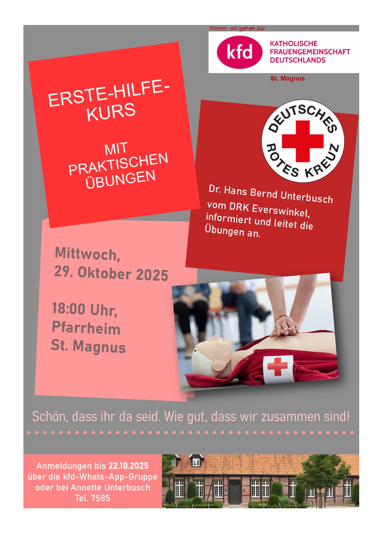 Die kfd Everswinkel lädt am Mittwoch, den 29. Oktober um 18 Uhr alle interessierten Frauen zu diesem Erste-Hilfe-Kurs ins Pfarrheim ein. Anmeldungen sind bis zum 22. Oktober über die Whats-App-Gruppe der Frauengemeinschaft oder bei Annette Unterbusch (Tel. 7585) ab sofort möglich.