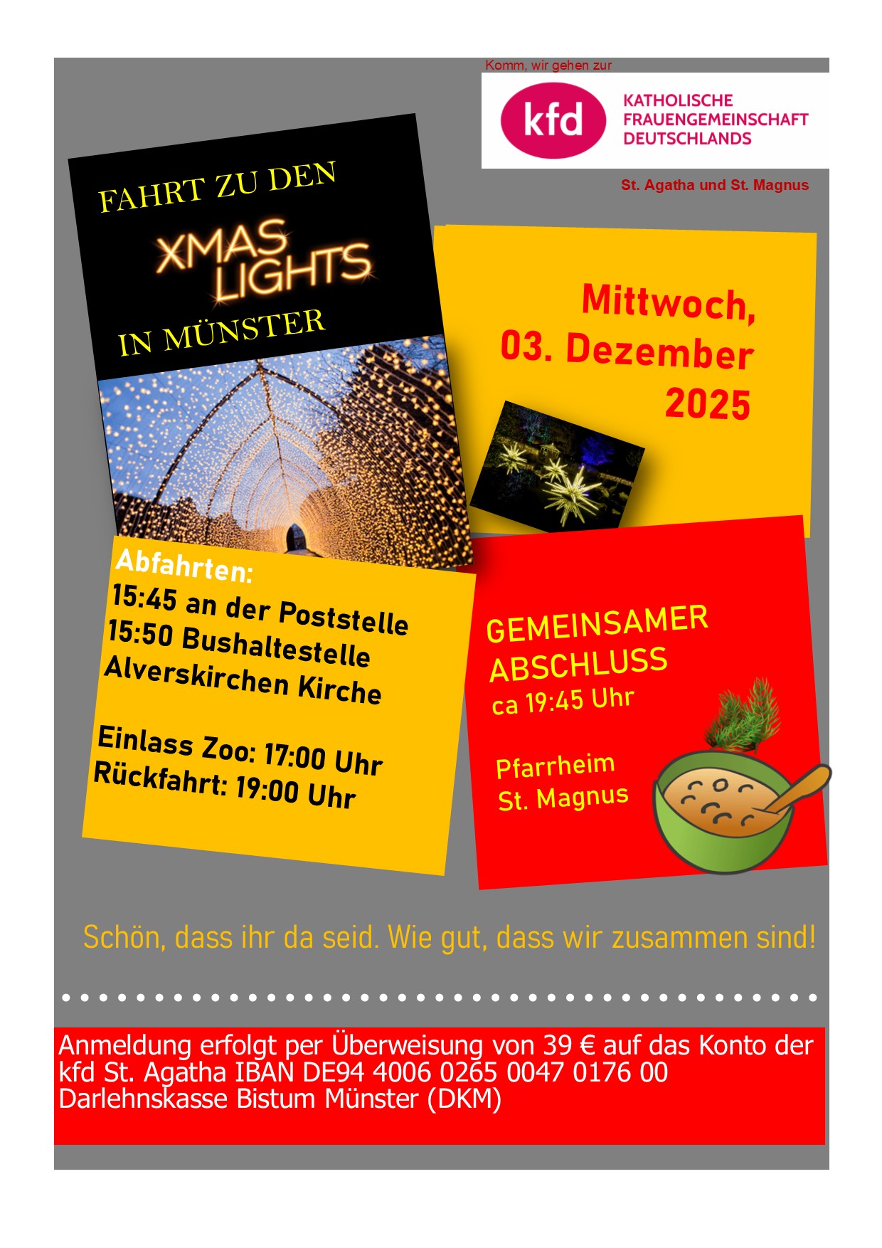 Die Gruppe startet in Everswinkel am 3. Dezember um 15.45 Uhr an der Poststelle und um 15.50 Uhr an der Kirche in Alverskirchen. Der Besuch des festlich illuminierten Zoos ist von 17 bis 19 Uhr geplant. Anschließend findet im Pfarrheim St. Magnus an der Nordstraße ein adventliches Beisammensein bei Suppe und Getränken statt. Für alle Gäste aus Alverskirchen wird für die Rückfahrt ein Shuttle-Service eingerichtet.