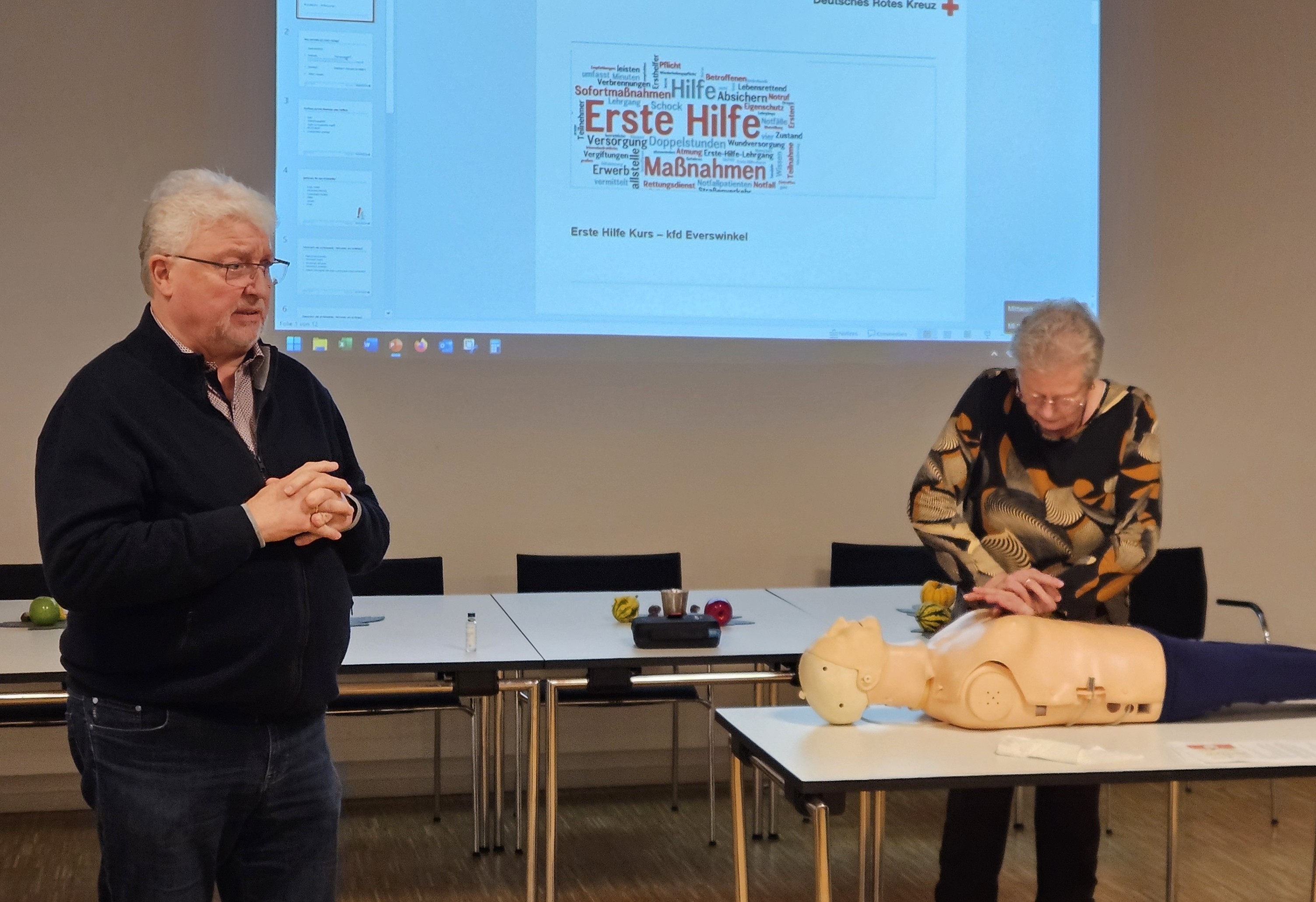 Wie lang sich zwei Minuten Druckmassage anfühlen können, konnte jede Teilnehmerin im Erste-Hilfe-Kurs selbst erfahren, zu dem die Frauen der kfd St Magnus am Mittwoch eingeladen hatten. Denn, wie versprochen, ganz praxisnah gestaltete Dr. Hans Bernd Unterbusch vom DRK Everswinkel den informativen Abend. Neben dem Aha-Erlebnisbei der Herzdruckmassage war es bei dem Vortrag besonders hilfreich, früher einmal Gehörtes und Gelerntes zu aktualisieren und aufzufrischen. Denn vor der doch für viele gar nicht so einfachen Übung, erhielten die Teilnehmerinnen kompaktes und gut verständliches Wissen in Sachen Erste Hilfe: Mit dem Stichwort FAST wie „Schnell“ ist es einfach, sich zu merken, wie Anzeichen eines Schlaganfalls möglichst sofort erkannt werden können und was zu tun ist. Gibt es erkennbare Veränderungen im Gesicht (Face), wie etwa ein plötzlich hängender Mundwinkel. Kann der Betroffene beide Arme gleichmäßig heben und drehen (Arm). Kann die Patientin deutlich artikulieren, oder die Dinge korrekt benennen? (Speech/Sprache) Und besonders wichtig, wenn diese Hinweise erkannt werden: Zeit (Time), klären, wie lange die Symptome schon bestehen und dann so schnell wie möglich die 112 wählen, denn beim Schlaganfall zählt jede Minute.