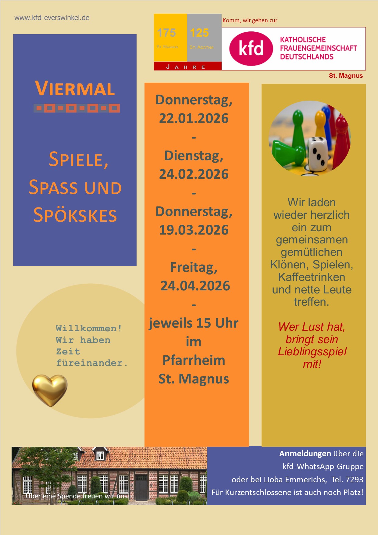 Anmeldungen für den ersten unterhaltsamen Nachmittag am 22. Januar können ab sofort über die kfd WhatsApp-Gruppe oder telefonisch bei Lioba Emmerichs (Tel. 7293) erfolgen. Aber auch für Kurzentschlossene gibt es im Pfarrheim immer noch einen Platz.